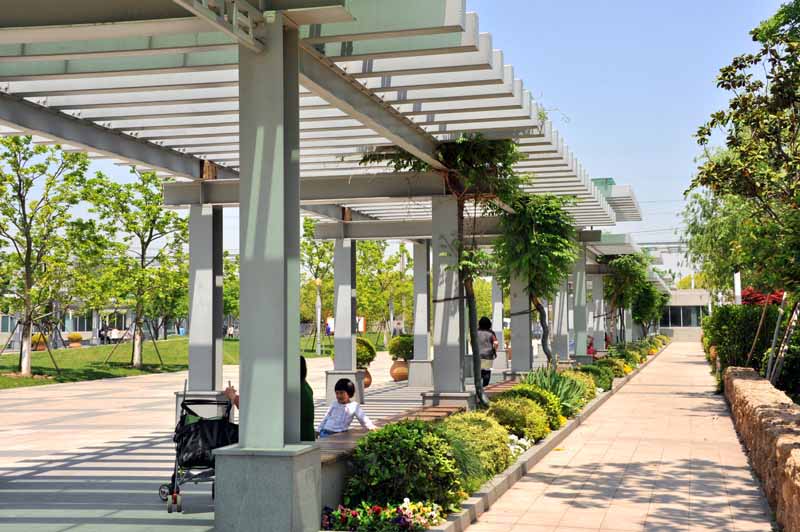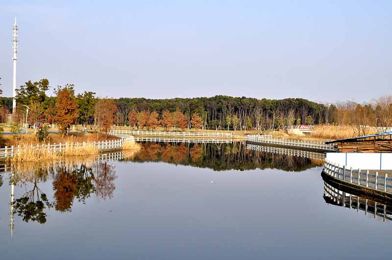 公園秉承生態(tài)、郊野的原則,突出玉蘭特色,園內(nèi)喬木疏朗整齊,草坪平整開闊。北入口以連廊串聯(lián)著4組精致主題園,軸線直指中心湖畔;南入口活潑、靈動與蒲匯塘結(jié)合的水上花園更是一景。外環(huán)線的林帶改造后與公園融為一體,成片的水杉林和南天竹是秋季紅葉爛漫的一大亮點。