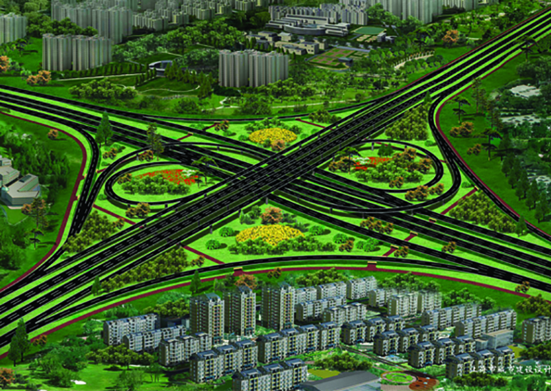 202國道松北段是哈爾濱市通往黑龍江省北部腹地的主要出城口,也是松北新區(qū)主要交通要道,南起松花江公路大橋,北至大耿家,全長9.6km,紅線寬度124m,設(shè)立交3座。國道斷面布置為主輔道,解決交通國道過境交通和新城區(qū)內(nèi)部交通混雜問題;根據(jù)橫向道路等級(jí)與建設(shè)條件,分別布置主線下穿的雞蛋型環(huán)島立交,中心對(duì)稱的半苜蓿葉半定向全互通式立交,快速路部分定向+環(huán)島的組合式互通立交。