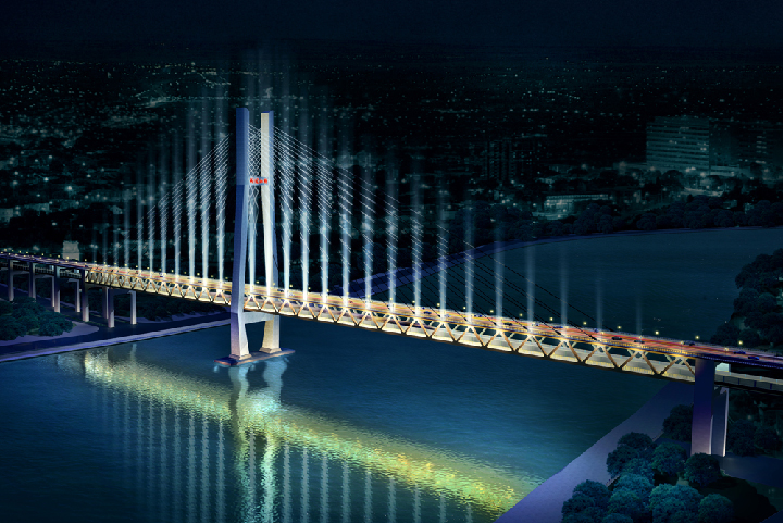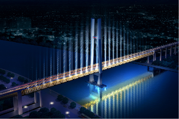 上海閔浦二橋是公軌兩用雙層斜拉橋,總長4.2km。工程采用彩色組合照明、數(shù)碼變色、節(jié)能控制等技術(shù),以絢麗繽紛的光影襯托閔浦二橋的宏偉氣勢。
