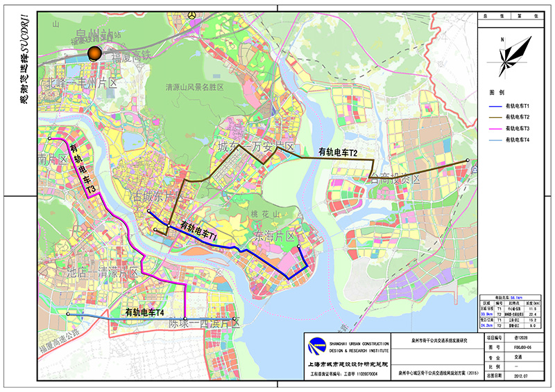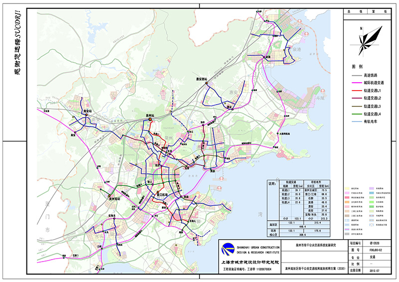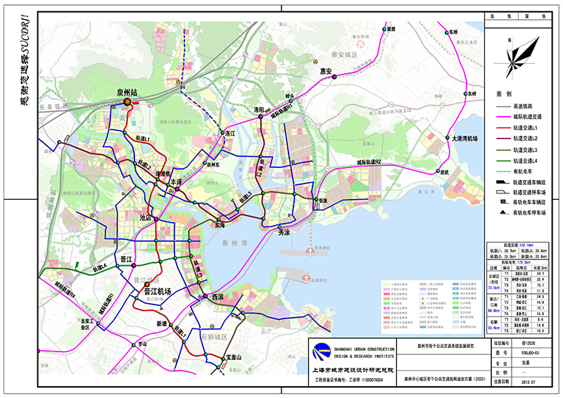 項(xiàng)目規(guī)劃范圍為泉州市環(huán)灣核心區(qū),面積約1221km2,規(guī)劃人口385萬(wàn)人,規(guī)劃提出三網(wǎng)合一的軌道交通網(wǎng)絡(luò),包括2條城際軌道、4條城市軌道和24條有軌電車(chē)線路。