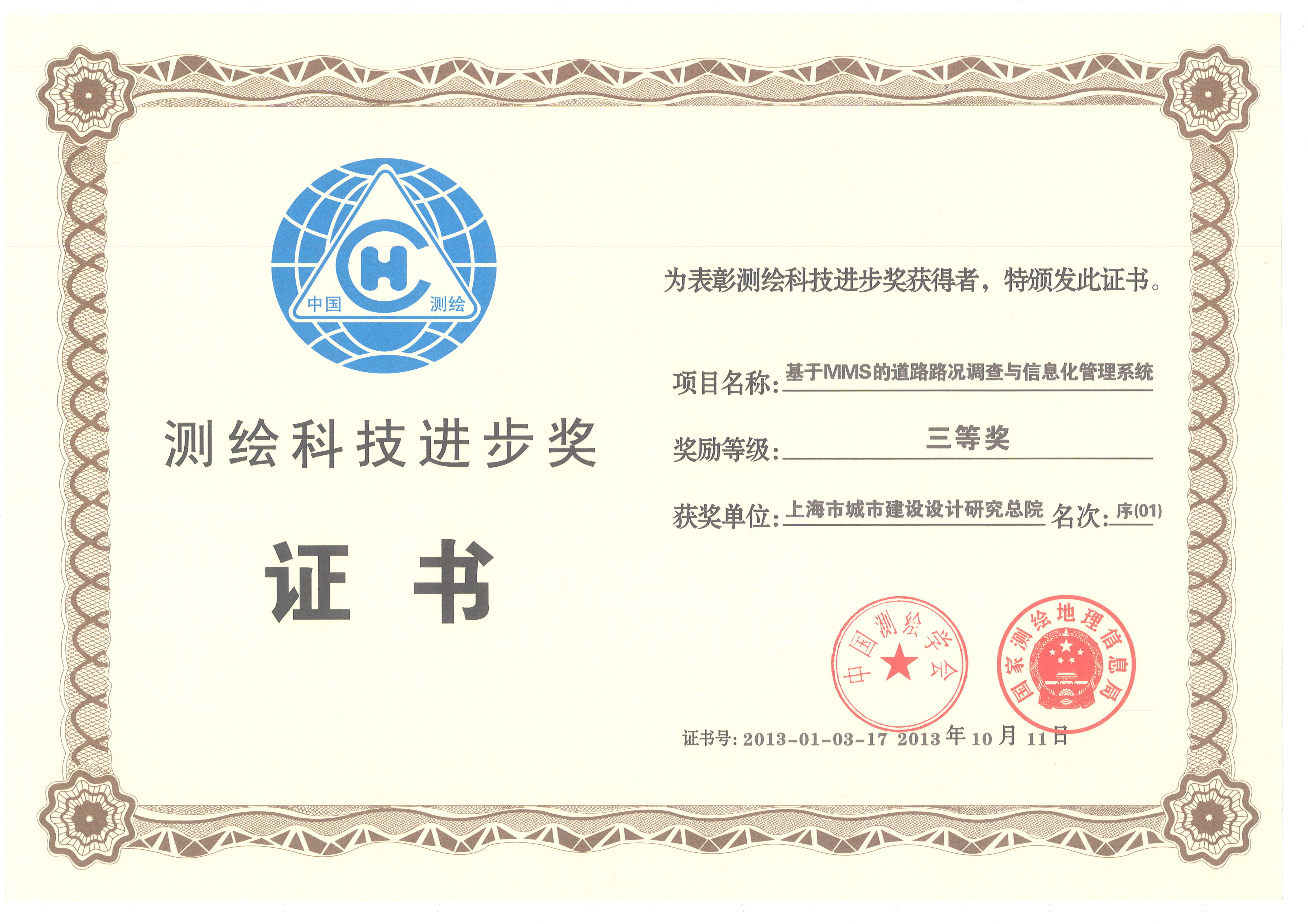 2013年度中國測繪科技進(jìn)步獎(jiǎng)三等獎(jiǎng)