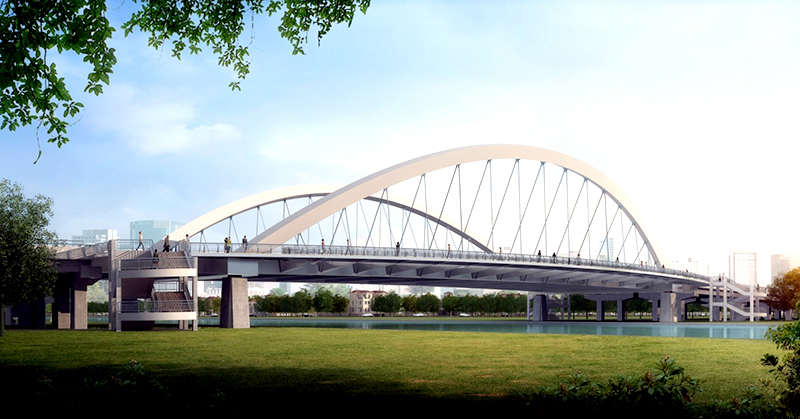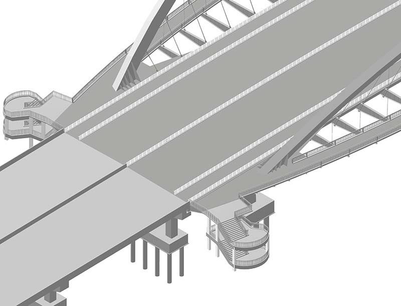 金匯港大橋是奉浦大道道路工程中的重要組成部分,全場432米。主橋為16m+100m+16m外傾拱肋下承式系桿拱,全鋼結(jié)構(gòu);引橋為東西兩側(cè)各5X30m共10孔組合小箱梁,結(jié)構(gòu)體系復雜。本項目的BIM應用開展對BIM應用于橋梁鋼結(jié)構(gòu)工程的實踐與探索,力求建立完整表達設計意圖、真實反映施工過程、有序管理施工進度的信息共享的平臺,提升項目管理的技術(shù)水平,也為今后類似工程剪力較為完整的操作程序,推動BIM技術(shù)的發(fā)展與深化。