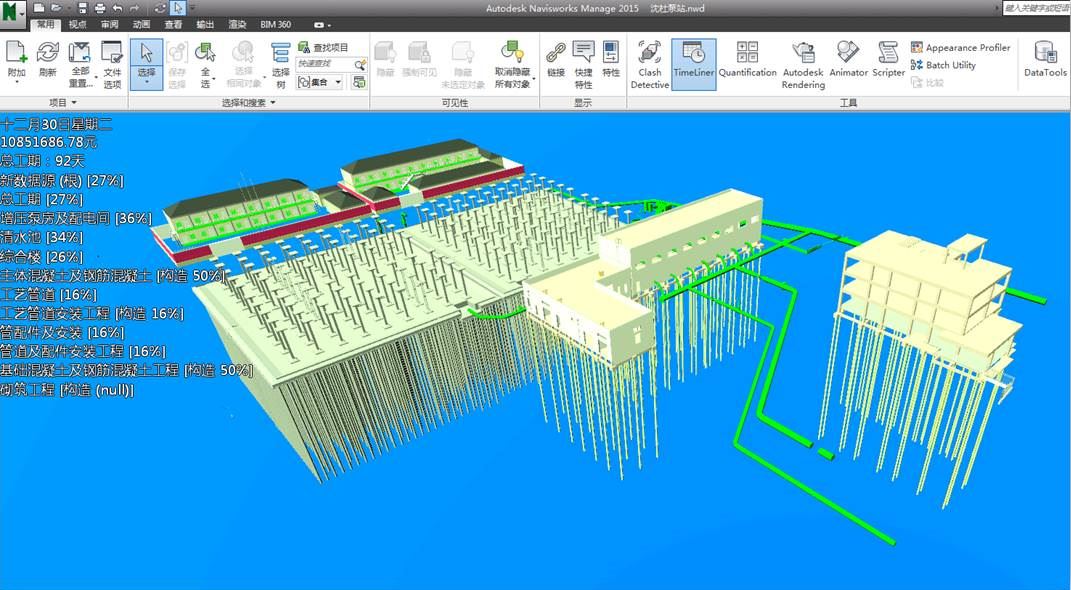 泵站總供水規(guī)模為6880m3/h,進浦江水庫泵站水頭為16.3m,出站壓力水頭為34.8m。泵站供水范圍為沈杜公路以南區(qū)域,供水規(guī)模為12.7萬m3/d,泵站總占地面積為17495㎡。根據(jù)項目工期緊、任務(wù)重的特點,我院從項目投標階段就采用BIM技術(shù)參與編制標書并直接出圖,為實現(xiàn)全壽命、全過程的BIM技術(shù)應(yīng)用走出第一步。同時,由于項目建筑風格及工藝管線、設(shè)備的布置選型包括后期運維均較為復(fù)雜,該項目的BIM技術(shù)應(yīng)用得到了業(yè)主方支持。