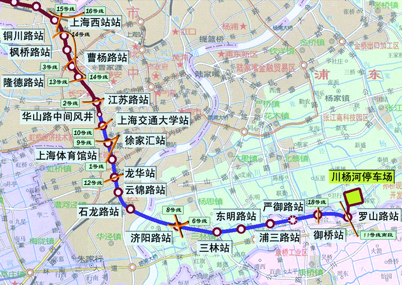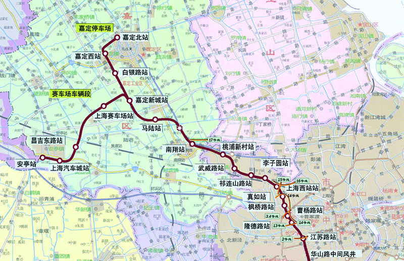 軌道交通11號線北段一期工程是上海市軌道交通網(wǎng)絡(luò)中構(gòu)成線網(wǎng)骨架的4條市域線之一,線路大致呈“西北—東南”走向,采取主線和支線兩條線路。一期工程線路經(jīng)嘉定區(qū)、普陀區(qū)、長寧區(qū)三個行政區(qū),工程全長約46km,共設(shè)21座車站,1處控制中心,2處主變電所,并設(shè)嘉定輔助停車場、賽車場車輛段各1座;二期工程線路經(jīng)長寧區(qū)、徐匯區(qū)、浦東新區(qū)三個行政區(qū),工程線路全長約21km,設(shè)13座車站,并設(shè)川楊河停車場1座。全線最高運(yùn)行速度100km/h。