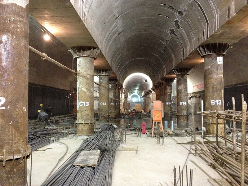 北京軌道交通昌平線工程昌平站,為地下二層12m島式站,采用雙柱三跨混凝土結(jié)構(gòu),頂覆土約7.4m,主體及附屬均采用暗挖施工。主體采用PBA(洞樁法)暗挖法施工,導(dǎo)洞條基法,上下共設(shè)8導(dǎo)洞,設(shè)置3個(gè)豎井橫通道,總工期34個(gè)月。出入口口部采用倒掛井壁法施工,與車站相接處采用CRD法施工,車站兩端與礦山法區(qū)間連接。