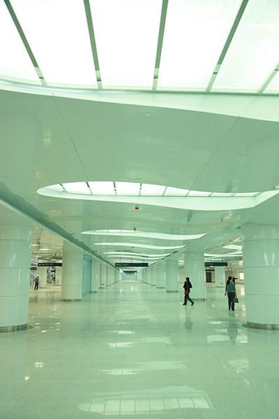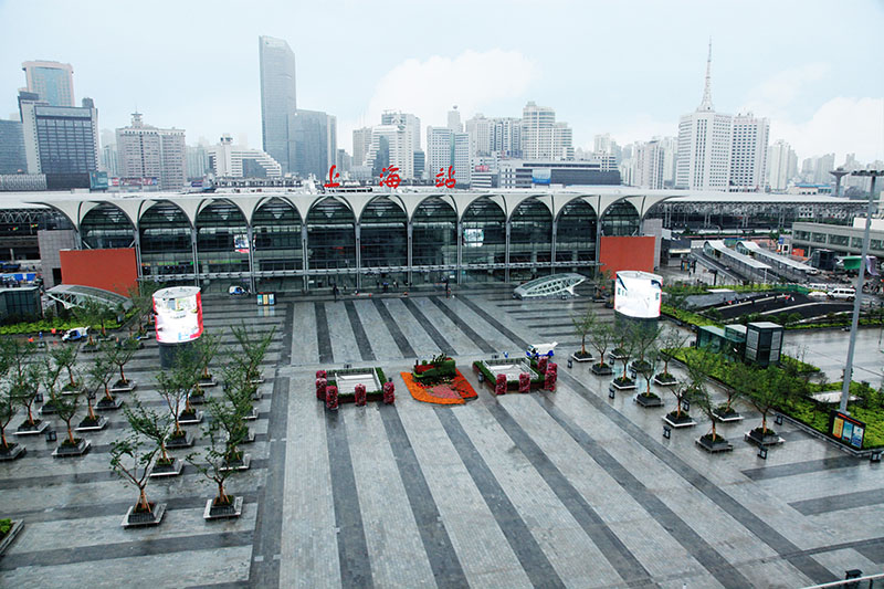 鐵路上海站北廣場交通樞紐是以鐵路為核心,軌道交通、常規(guī)地面公交、出租車、長途汽車、靜態(tài)交通等多種交通方式一體化綜合換乘的特大型客運交通樞紐,遠期日客流量達七十萬人次。工程總用地約7.6公頃,工程內(nèi)容包括:地面廣場、公交站場、地下軌道交通3、4號線車站改擴建工程、地下停車及換乘空間。16條公交始末站分列廣場東西兩側(cè),采用同側(cè)進出交通組織方式;站前人行廣場面積約2.8萬平方米;地下空間面積約7.2萬平方米,設兩層交通集散層及社會停車場。