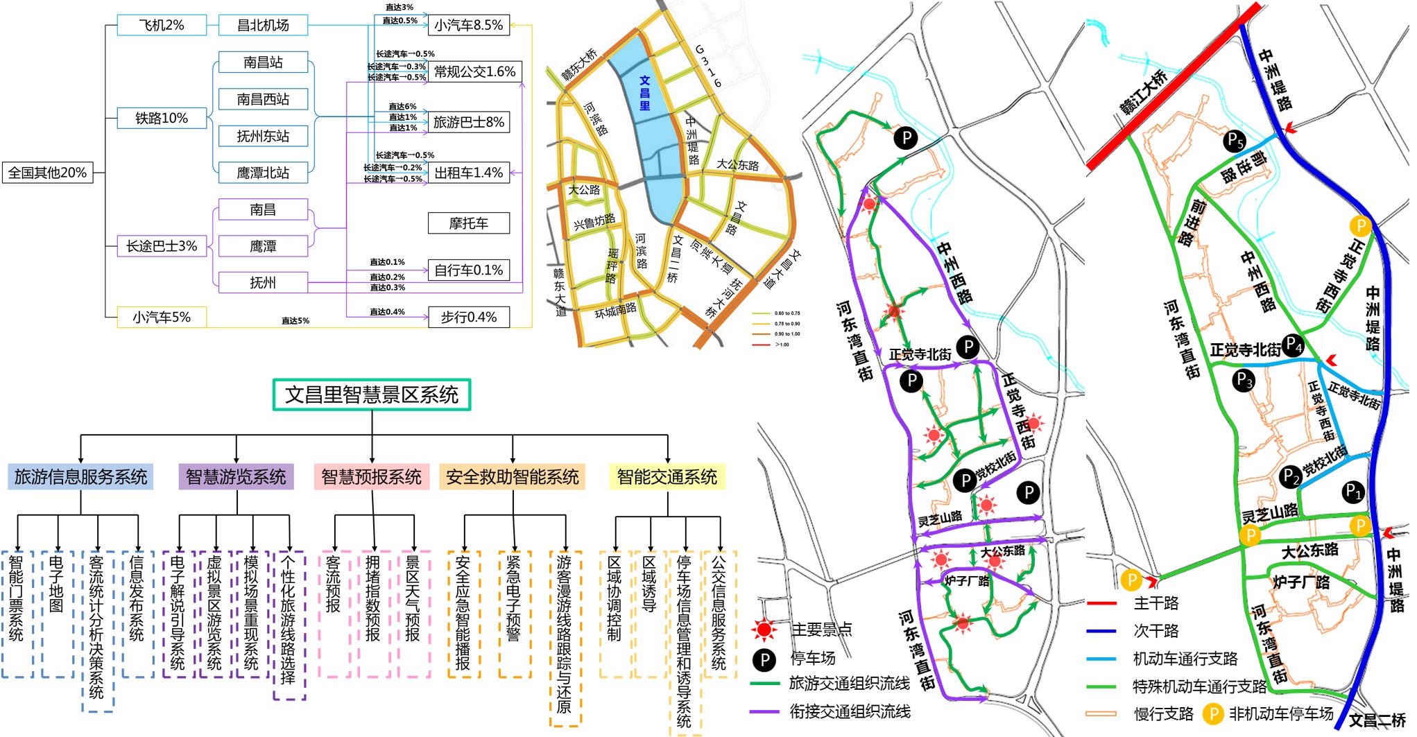 規(guī)劃方案從旅游交通組織入手,在道路系統(tǒng)規(guī)劃中引入了街道類型劃分概念,明確道路建設(shè)指引,保證與歷史街區(qū)的和諧統(tǒng)一;在慢行系統(tǒng)規(guī)劃中,提出“2島、3軸、4區(qū)”的慢行系統(tǒng)空間結(jié)構(gòu),落實“人文、生態(tài)、活力、智慧”4大規(guī)劃理念,并對文昌里的慢行系統(tǒng)服務(wù)水平進行了定量評價;在智能交通系統(tǒng)規(guī)劃中,引入了區(qū)域協(xié)調(diào)控制、區(qū)域誘導(dǎo)、停車場信息管理系統(tǒng)等,制定了大客流應(yīng)急預(yù)案,提出“互聯(lián)網(wǎng)+智慧景區(qū)”、“線上遠程網(wǎng)絡(luò)虛擬現(xiàn)實(VR)三維景點”、“線下增強現(xiàn)實(AR)、歷史場景數(shù)字再現(xiàn)”等旅游新概念的設(shè)想。