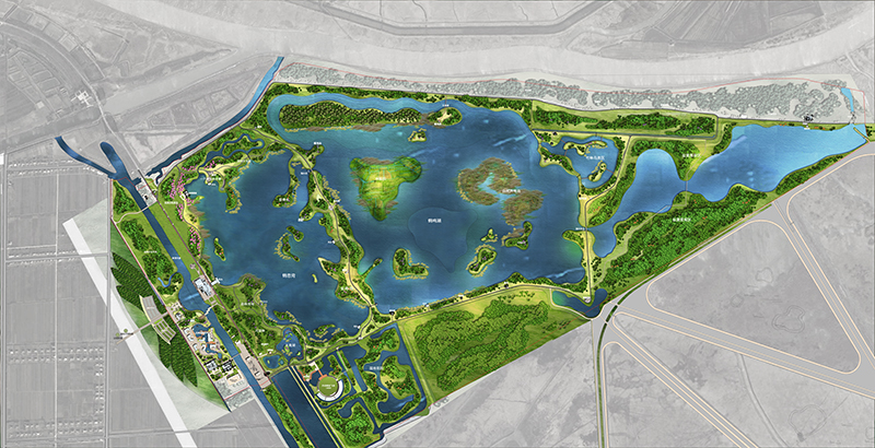 設計以綠色植物為背景,以藍色水系為特點,建設融生態(tài)功能、科研考察功能、休閑功能為一體的生態(tài)濕地保護區(qū)。濕地重建區(qū)內(nèi)的水域分為內(nèi)部系統(tǒng)和外部系統(tǒng),內(nèi)部系統(tǒng)主要起到凈化區(qū)域內(nèi)水質(zhì)的作用,實現(xiàn)水體生態(tài)景觀功能化,建設蜿蜒曲折的水岸線;外部系統(tǒng)主要起到連通的作用。重點處理好區(qū)內(nèi)水系、植被、活動等各組成要素的關系,整體有序協(xié)調(diào)發(fā)展。濕地重建區(qū)域內(nèi)結合濕地水系,重塑自然生態(tài)開放游憩空間。