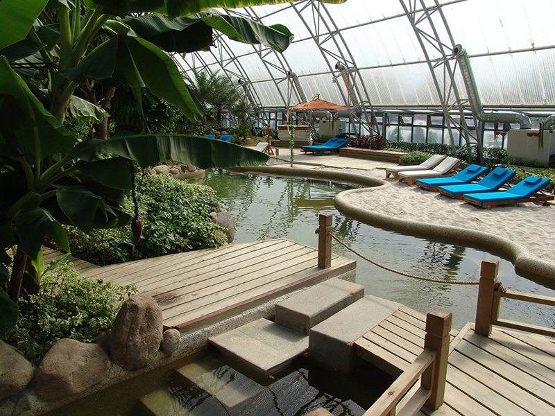 本項(xiàng)目的建設(shè)以展示社會主義新農(nóng)村建設(shè)、城市農(nóng)家樂為特色,突出高新科技在新農(nóng)村建設(shè)應(yīng)用與體驗(yàn)。建成后的浦江源溫泉農(nóng)莊將成為新型休閑旅游開發(fā)項(xiàng)目的示范窗口。溫泉農(nóng)莊以挖湖堆山的造園手法在溫室大棚中模擬熱帶雨林自然環(huán)境,利用地形的變化,結(jié)合植物以及瀑布、音響等效果,使置身于內(nèi)的人們深刻感受到熱帶雨林的氣息。示范區(qū)內(nèi)的水源來自基地內(nèi)的溫泉泉水。