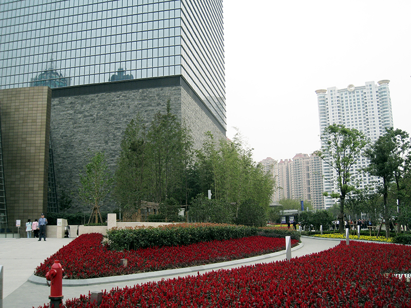上海環(huán)球金融中心位于浦東新區(qū)陸家嘴金融貿(mào)易中心區(qū)。其環(huán)境設(shè)計(jì)采用與金融區(qū)現(xiàn)代化環(huán)境特色相匹配的綠化布局風(fēng)格,植物配置采用列植的形式,簡(jiǎn)潔、大氣。與傳統(tǒng)景觀意境相結(jié)合的 “竹徑”設(shè)計(jì),是整個(gè)項(xiàng)目的點(diǎn)睛之筆,選用的植物品種:白玉蘭、櫻花和水杉,將海派文化、日本文化和企業(yè)文化很好地融合在一起。